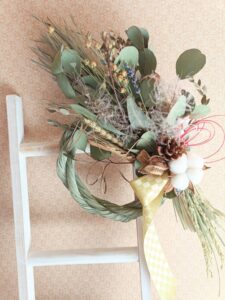 ハーブや木の実、水引などのお正月素材などをあしらっていきます。